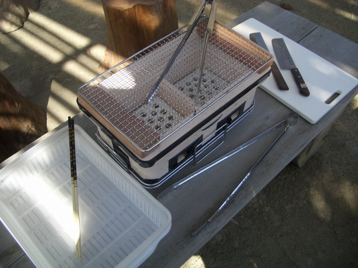 ・道具類(コンロ&炭、網、火箸、トング、包丁、まな板、野菜トレイ)・・・